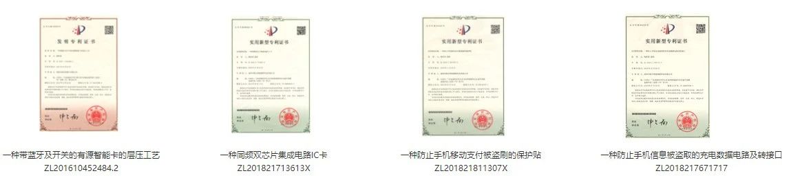 自2011年成立至今,“聯合智能”不斷獲得衆多客戶的認可和好評,並(bìng)先後獲得衆多國内外著名商業機構認可,取得數字貨币可視卡、智能屏蔽卡、CPU卡、NFC可視電(diàn)子标簽、RFID電(diàn)子标簽、有源藍牙卡冷壓工藝等2項發明專利和10項實用新型專利、1項國際PCT和22項軟件著作權。2015年,“聯合智能”通過ISO9001質量體系認證和ISO4001環境管理體系認證。
